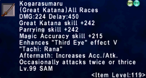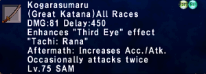 | Stage 1 | 1x Kogarasumaru(Incomplete) 1000x Imperial Bronze Pieces 1x Balrahn's Eyepatch All T1 ZNM Clears |
