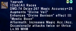 | Stage 4 | 1x Yagrush Lvl 95 300x Imperial Gold Pieces All T4 ZNM Clears 1x Sindri 5x Nibiru Cudgel |