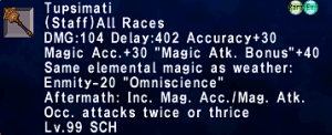 | Stage 1 | 1x Tupsimati(Incomplete) 1000x Imperial Bronze Pieces 1x Balrahn's Eyepatch All T1 ZNM Clears |