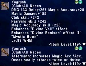 | Stage 2 | 1x Yagrush Lvl 75 400x Imperial Silver Pieces 600x Alexandrite All T2 ZNM clears 15x Aedold +2 |