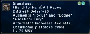 | Stage 1 | 1x Glanzfaust (Incomplete) 1000x Imperial Bronze Pieces 1x Balrahn's Eyepatch All T1 ZNM Clears |