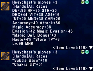 | Hands | x1 Hesychasts Gloves +2 x3 Handshard: MNK x3 Voidhand: MNK x3 Macuil Plating |