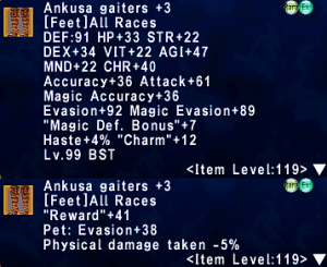 | Feet | x1 Ankusa Gaiters +2 x3 Footshard: BST x3 Voidfoot: BST x3 Plovid Flesh |