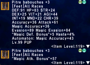 | Feet | x1 Pitre Babouches +2 x3 Footshard: PUP x3 Voidfoot: PUP x3 Plovid Flesh |
