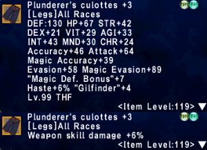 | Legs | x1 Plunderer’s Culottes +2 x3 Legshard: THF x3 Voidleg: THF x3 Tartarian Soul |