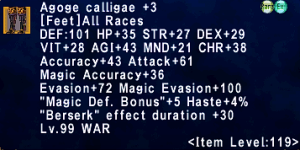 | Feet | x1 Agoge Calligae +2 x3 Footshard: WAR x3 Voidfoot: WAR x3 Plovid Flesh |