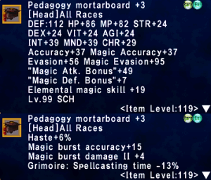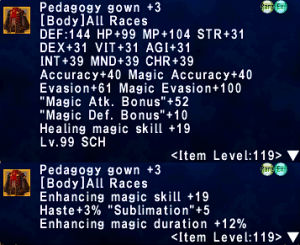 | Body | x1 Pedagogy Gown +2 x3 Torsoshard: SCH x3 Voidtorso: SCH x3 Hades' Claw |