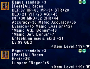 | Feet | x1 Bagua Sandals +2 x3 Footshard: GEO x3 Voidfoot: GEO x3 Plovid Flesh |