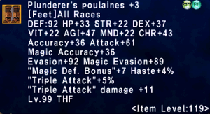 | Feet | x1 Plunderer’s Poulaines +2 x3 Footshard: THF x3 Voidfoot: THF x3 Plovid Flesh |