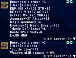 | Head | x1 Hesychats Crown +2 x3 Headshard: MNK x3 Voidhead: MNK x3 Defiant Scarf |
